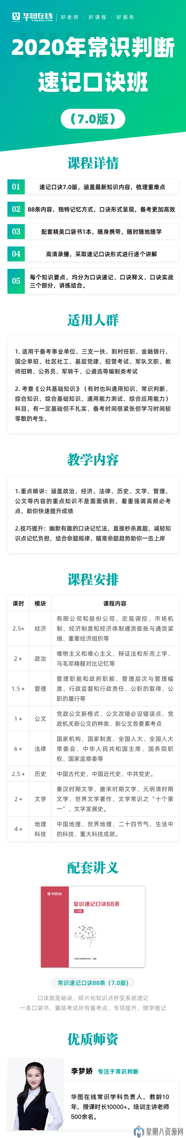 华图在线常识学科负责人,教龄10年,授课时长10000+。培训主讲老师500余名。各类公考教材编著者,口诀速记法创始人。授课思路清晰严谨,深入浅出,考点明确,重点突出。精准把握命题方向,屡创命中奇迹。