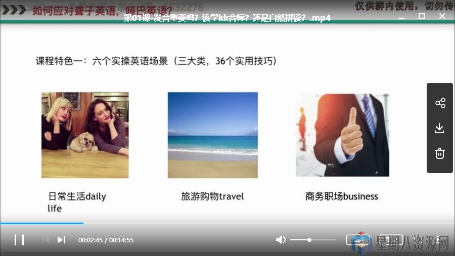 口语课的应用训练,囊括了生活社交、职场商务、旅游购物这三个大的方面。涵盖了实际生活中我们都会遇到的各种场景和问题。